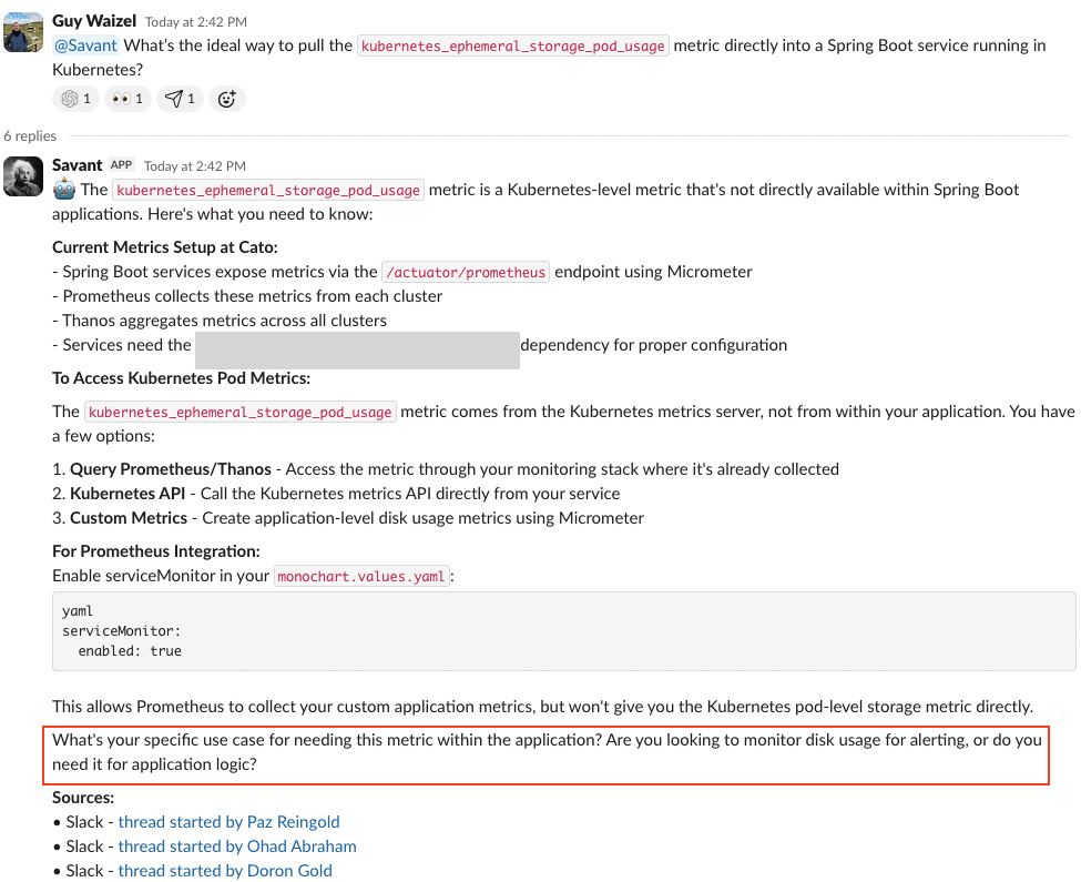 When engineers ask about past technical decisions or request guidance on a similar suggestion today, Savanti reconstructs the full reasoning behind the original choice. It surfaces design docs, Slack discussions, PRs, and related project history then asks clarifying questions to refine the answer (Figure 4), and provide more precise recommendations. (Figure 5).